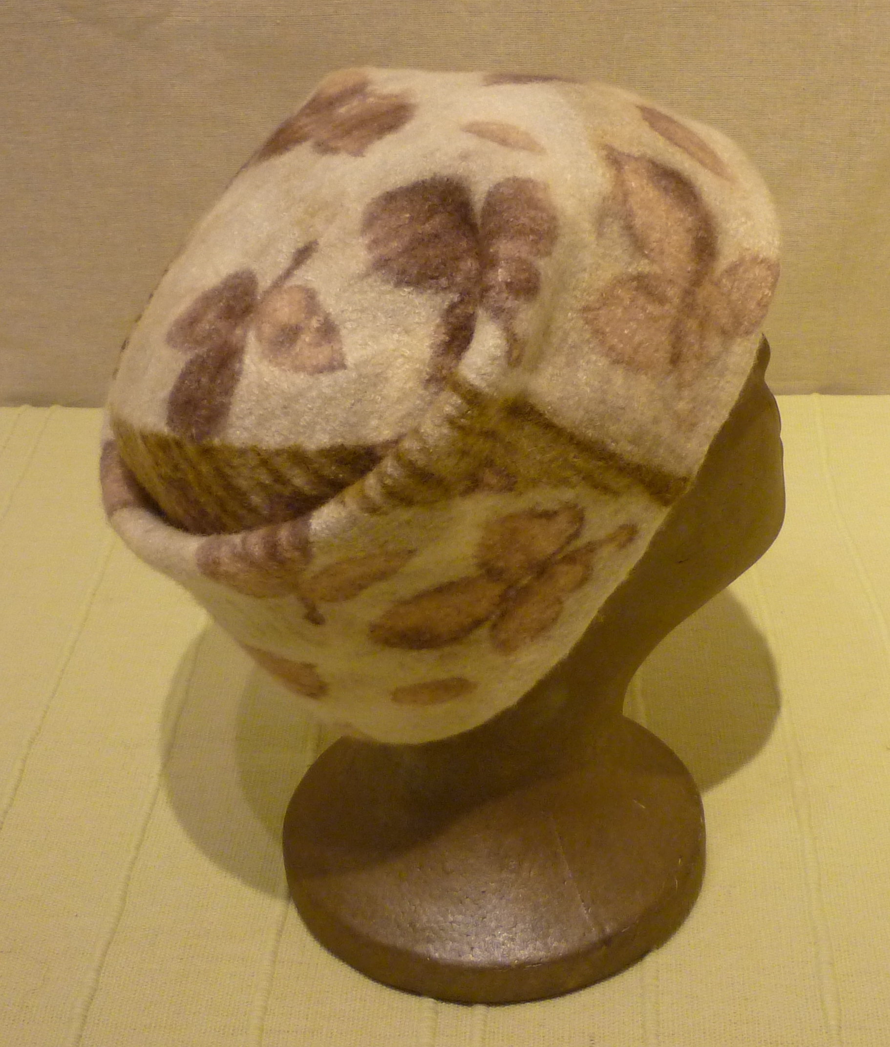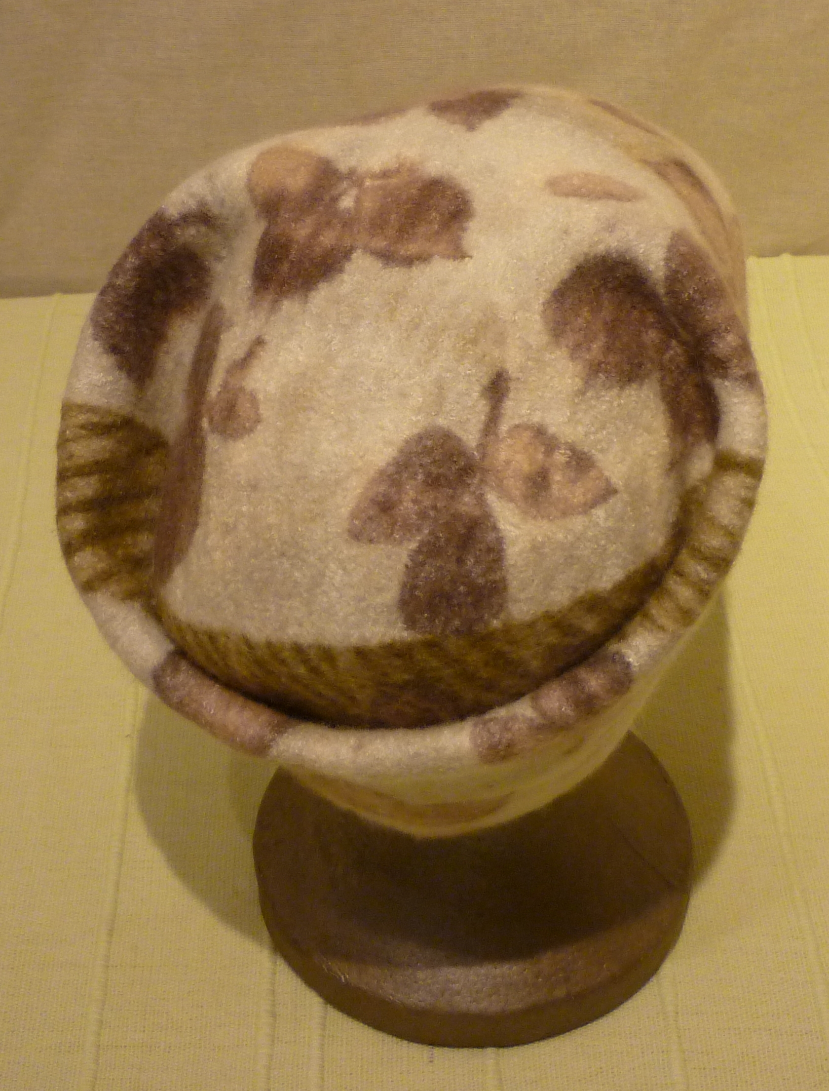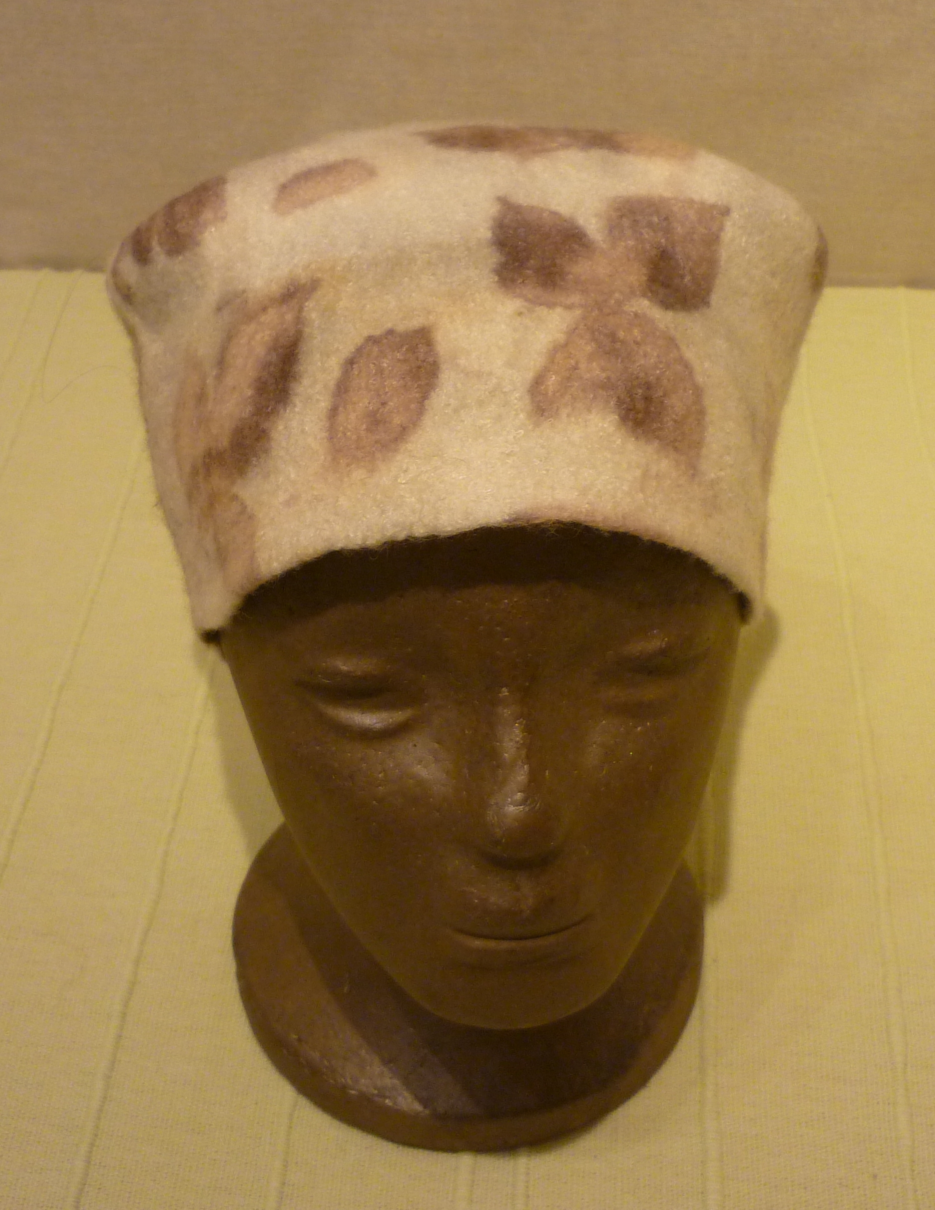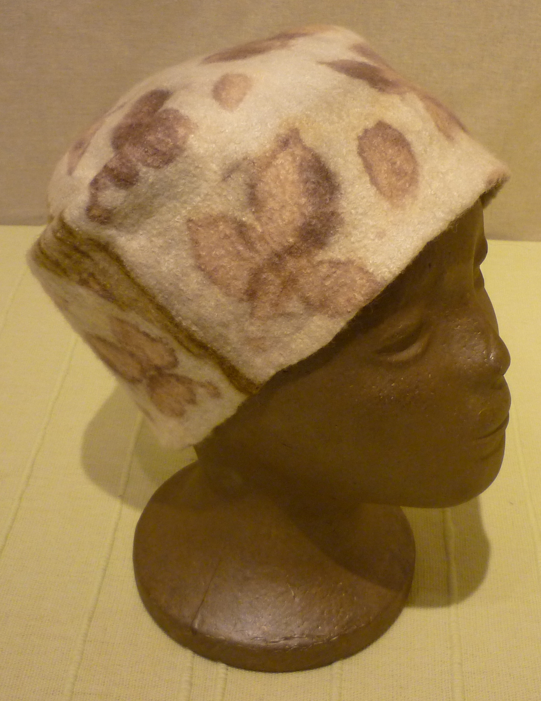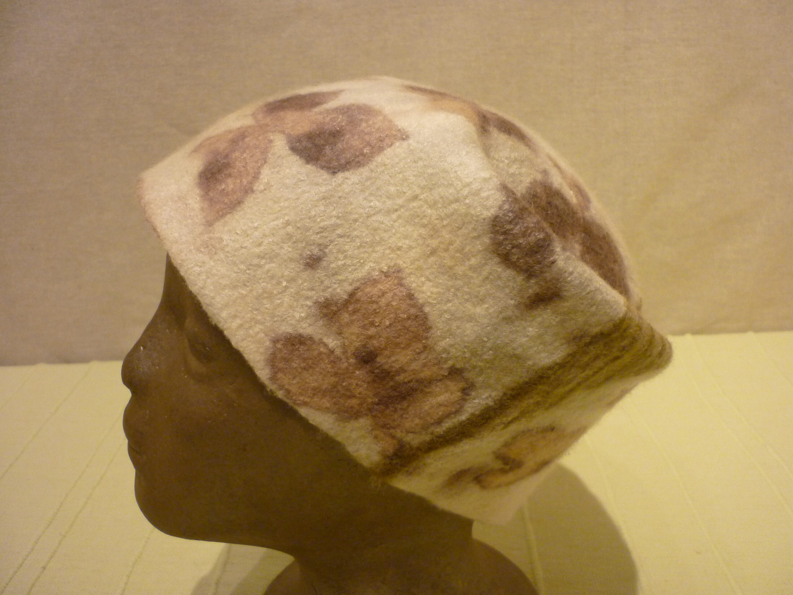 This little hat is hand made using pure super fine merino wool and wild silk fibres and ecoprinted with locally foraged blackberry leaves.