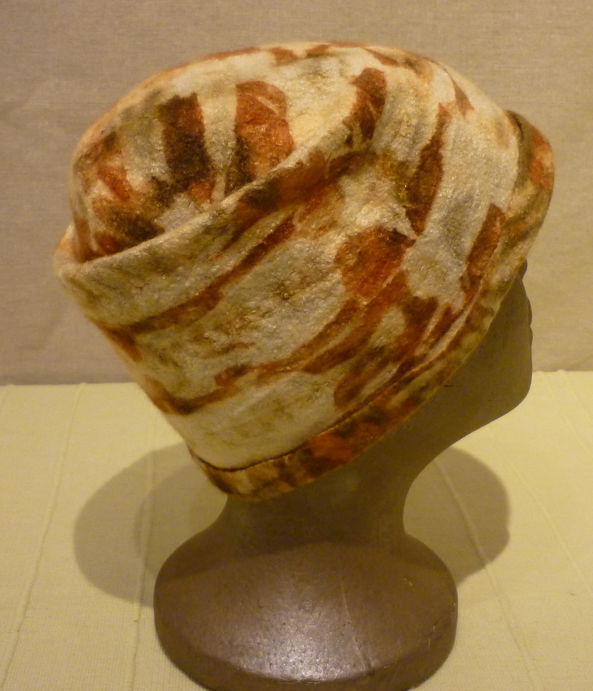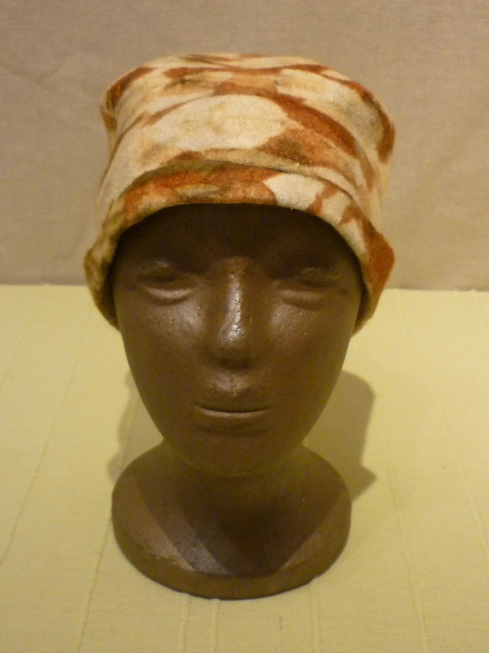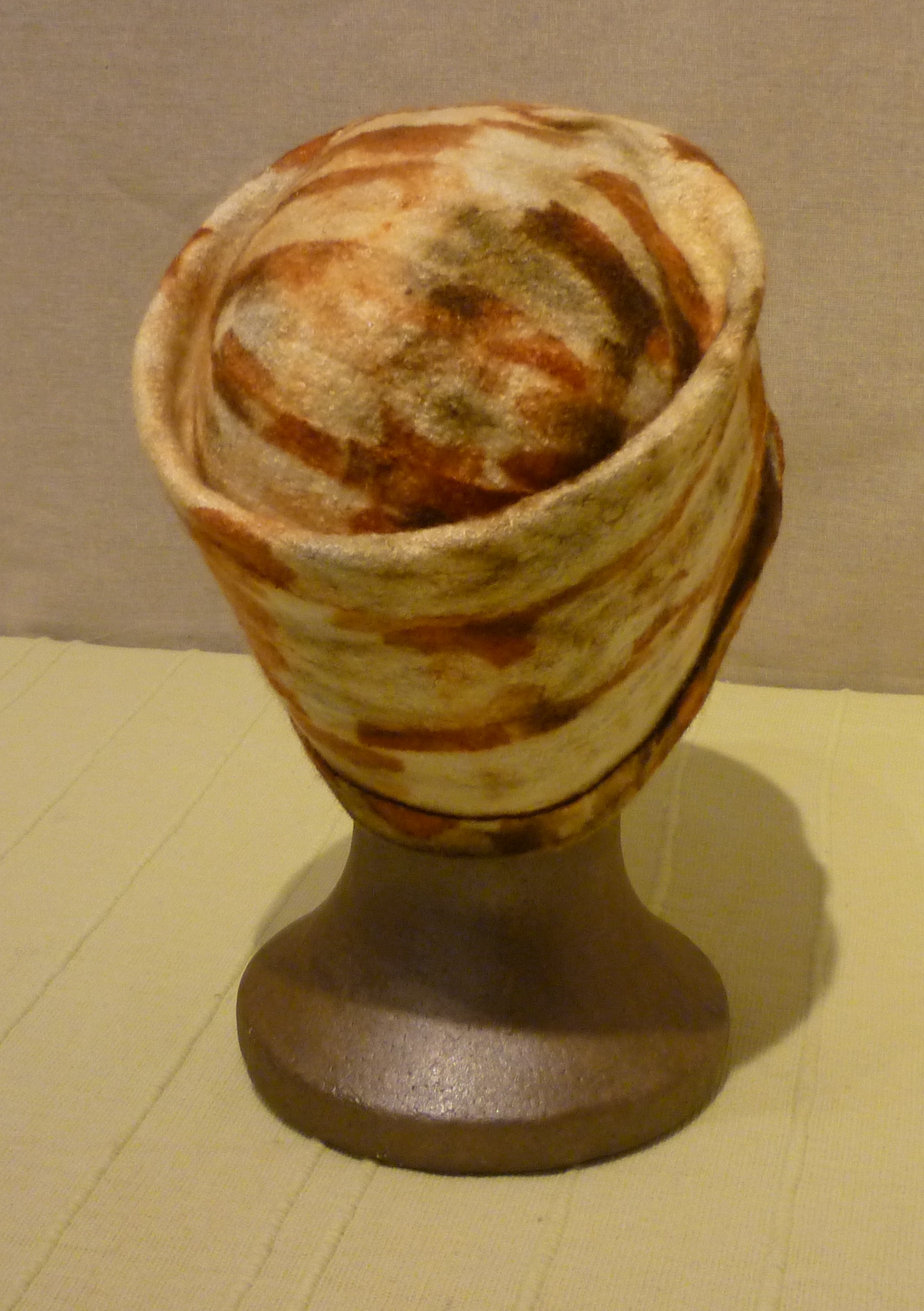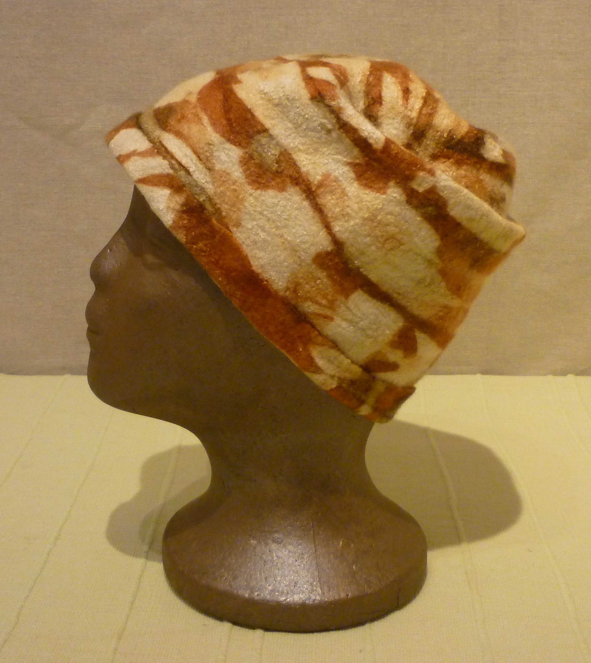 This little hat is hand made using pure super fine merino wool and wild silk fibres and ecoprinted with onion skins in a shibori style.