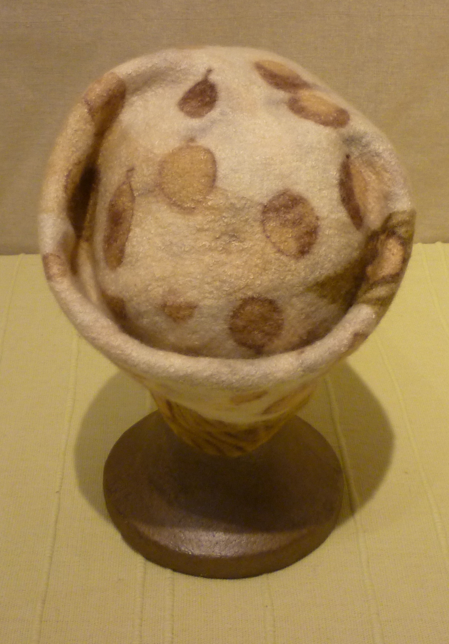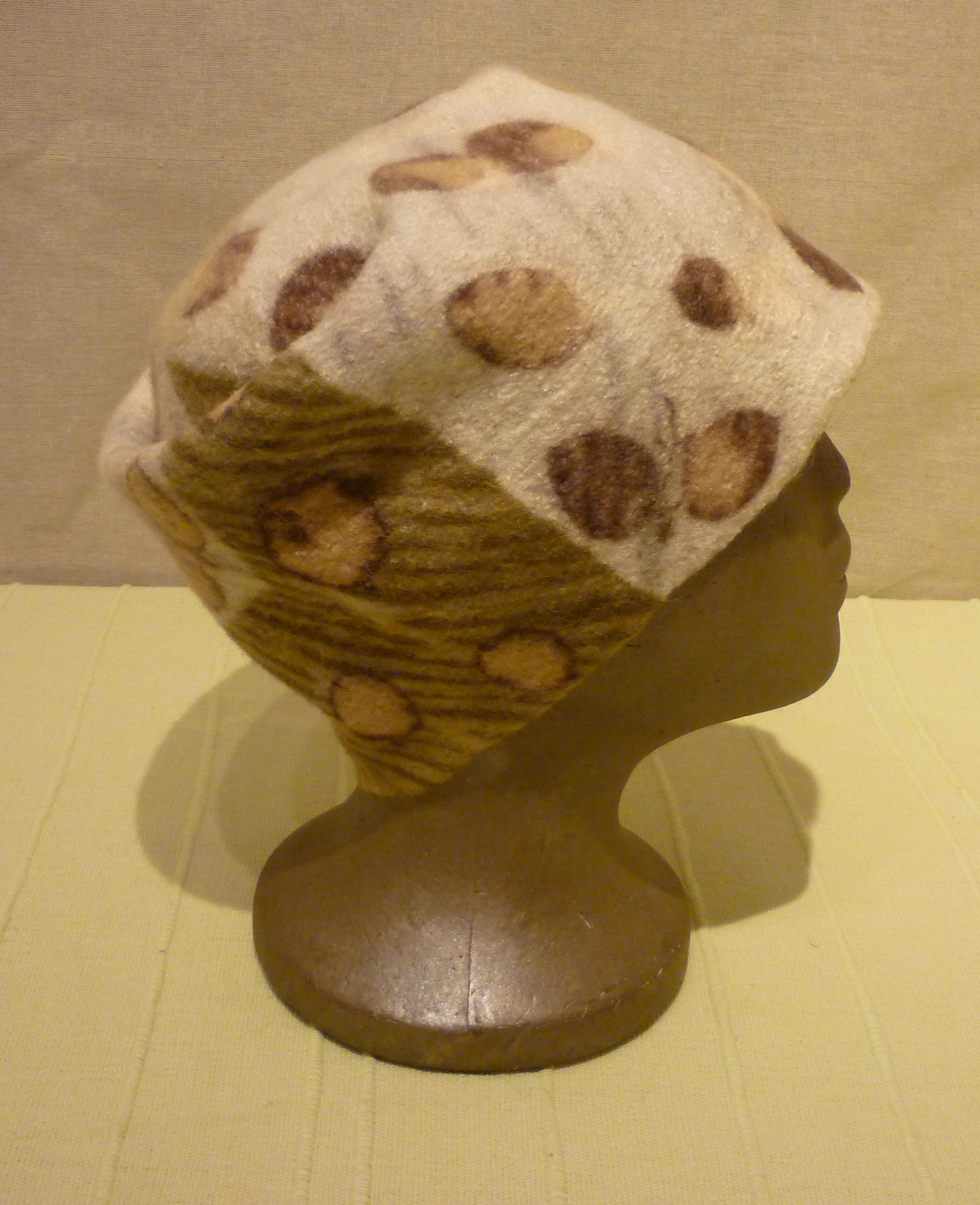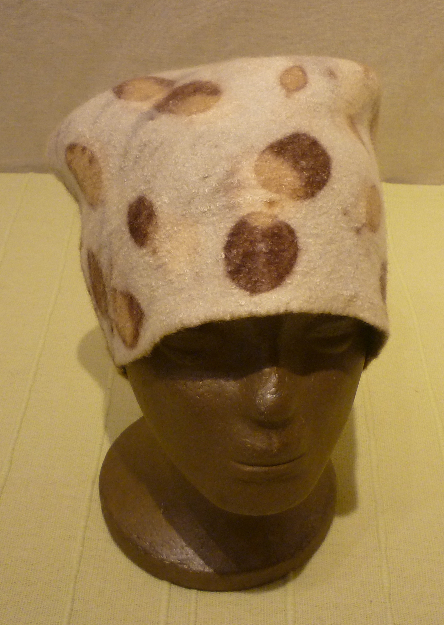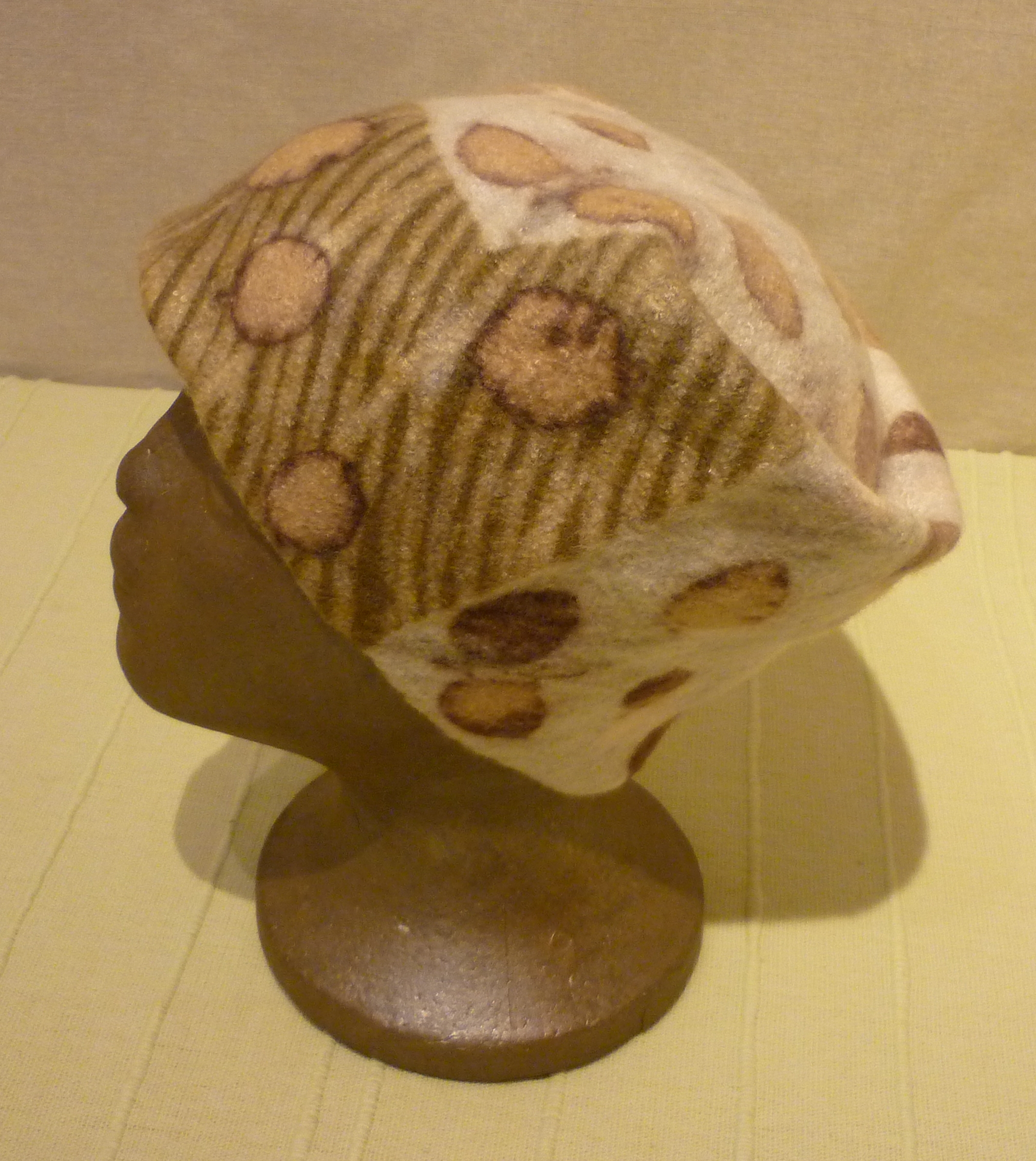 This little hat is hand made using pure super fine merino wool and wild silk fibres and ecoprinted with locally foraged Eucalyptus leaves.
